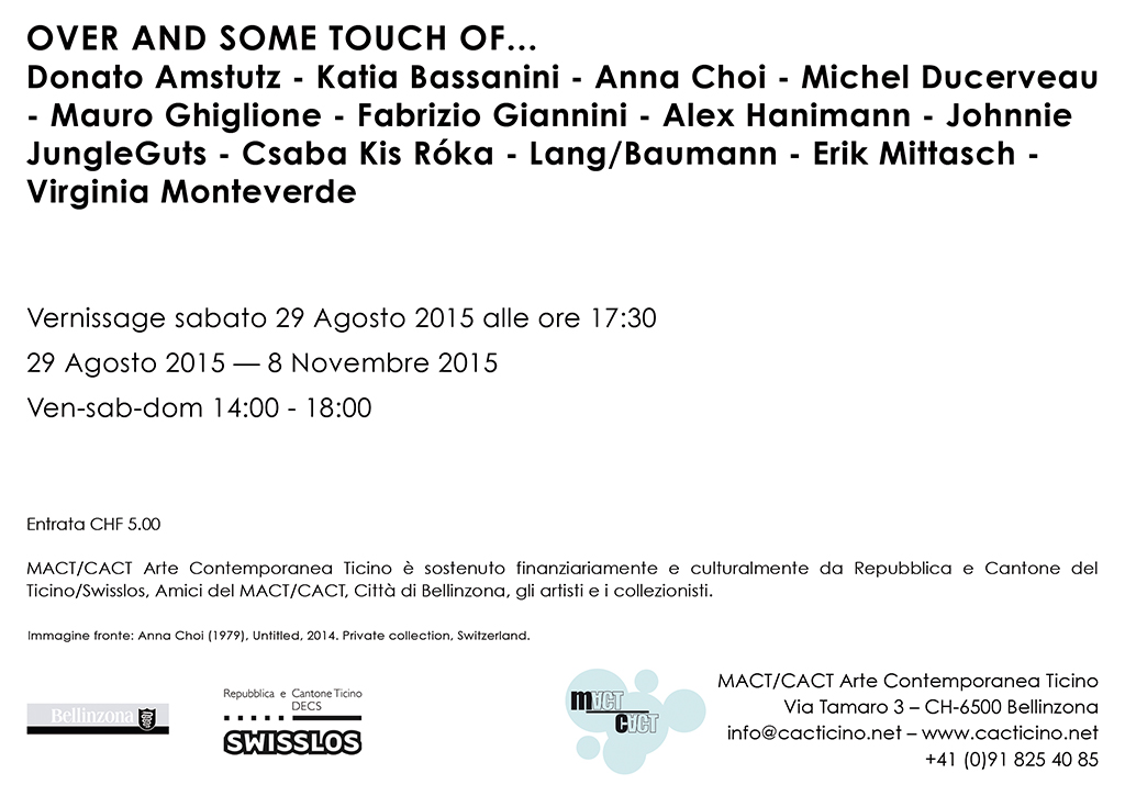 OVER AND SOME TOUCH OF… Donato Amstutz, Katia Bassanini, Anna Choi, Michel Ducerveau, Mauro Ghiglione, Fabrizio Giannini, Alex Hanimann, Johnnie JungleGuts, Csaba Kis Róka, Lang/Baumann, Erik Mittasch, Virginia MonteverdeVernissage on Saturday 29 August 2015 from 5.30 p.m.29 August – 8 November 2015 Fri-Sat-Sun from 2.00 to 6.00 p.m.